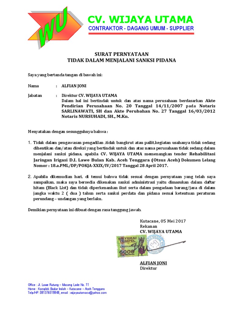 Tidak pernah memperoleh hukuman penjara yang disebabkan karena perbuatan melanggar. Contoh surat pernyataan tentang kesanggupan. Kedua yaitu isi pernyataan yang ingin disampaikan dan yang terakhir penutup berisi tanggal dan. tulis nama perusahaan alamat : 6.6 contoh surat pernyataan tidak pernah dijatuhi pidana. Pada kesempatan kali ini kita masih akan belajar materi mengenai surat, yaitu contoh surat pernyataan. Umumnya, surat pernyataan kerja adalah surat yang dikeluarkan oleh perusahaan dengan menegaskan bahwa orang yang dijelaskan didalamnya pernah atau sedang bekerja di perusahaan tersebut. Untuk menyatakan dan menegaskan bahwa kita telah atau tidak melakukan sesuatu. Surat pernyataan ini juga dapat dibuat oleh segolongan kelompok yang mana untuk mencapai suatu kesepakatan dengan kelompok lainnya. 26 agustus 2017 oleh jamez shame. Surat pernyataan juga bisa digunakan untuk menimbulkan efek jera bagi seseorang yang melanggar aturan di suatu tempat. Itulah contoh surat pernyataan kerja yang menyatakan bersedia menjalani ikatan dinas dan bersedia tidak menikah selama ikatan dinas. Materi kali ini akan membahas mengenai contoh surat pernyataan kerja, perjanjian, kesanggupan, diri, kesalahan beserta pengertian dan fungsinya.